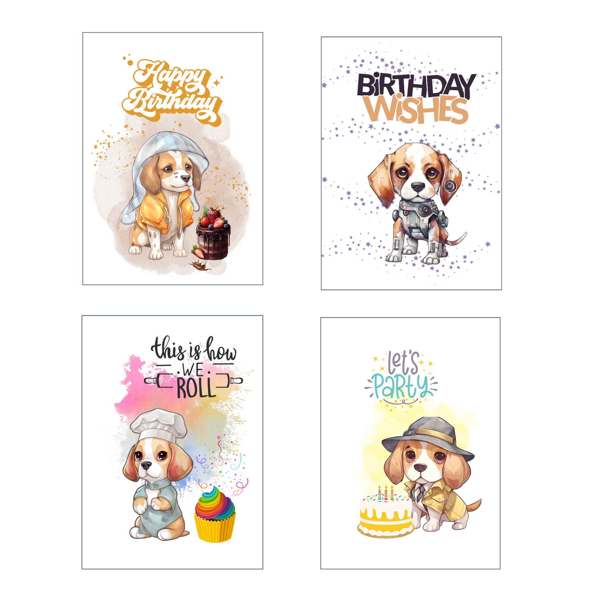 Beagle Birthday Bash – Set of 4 Printable 5x7 Greeting Cards