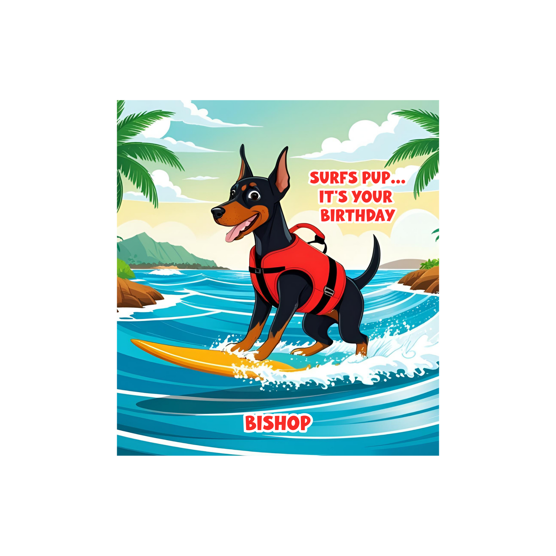 Make their special day a splash of fun with this adorable 5.5" x 5.5" Personalized Birthday Greeting Card featuring a cool dog surfing a wave! Choose from one of seven lovable breeds — Doberman Pinscher, Labrador Retriever, Rottweiler, Poodle, Beagle, German Shepherd, or French Bulldog — each riding the perfect wave in tropical style.